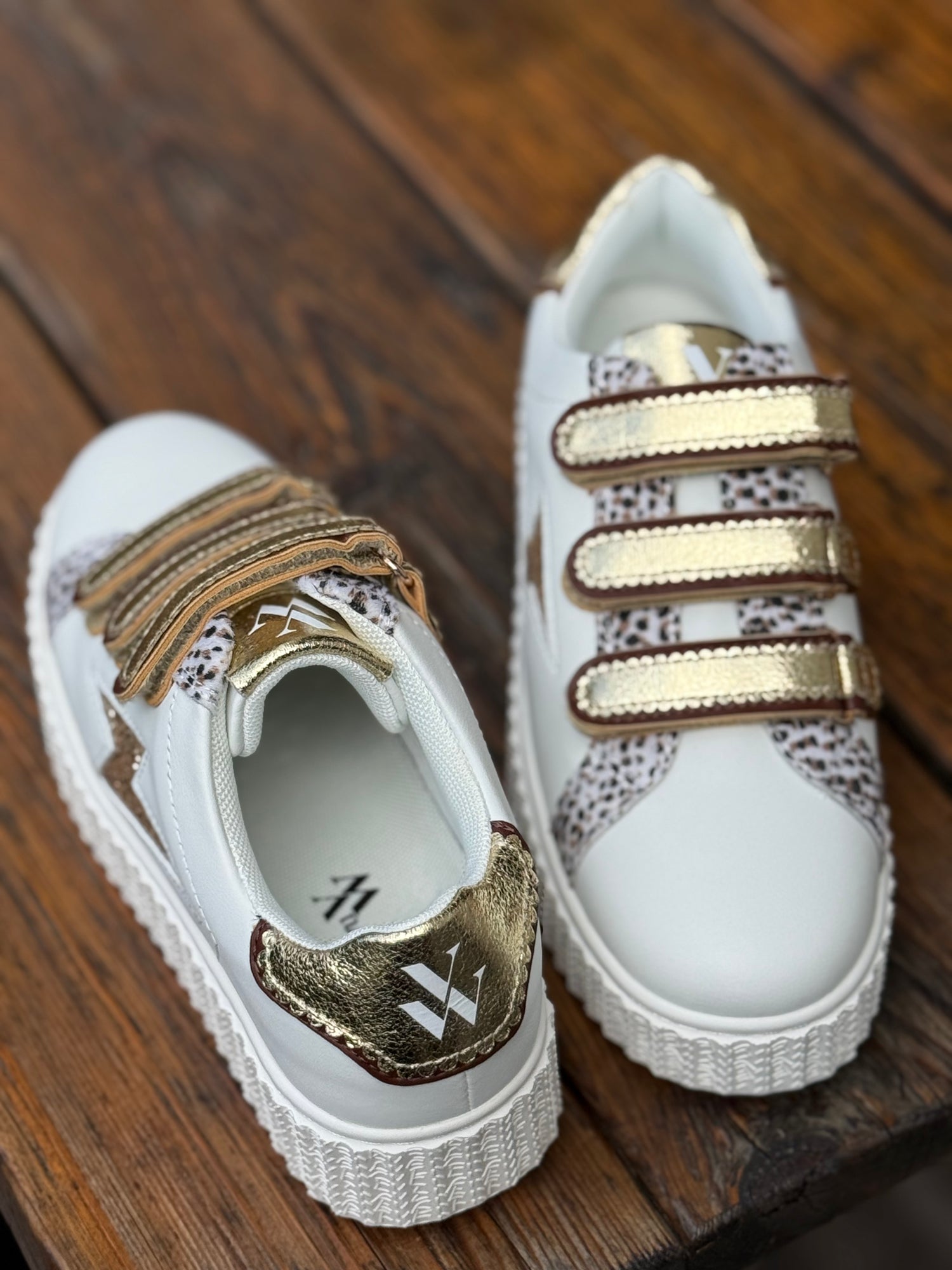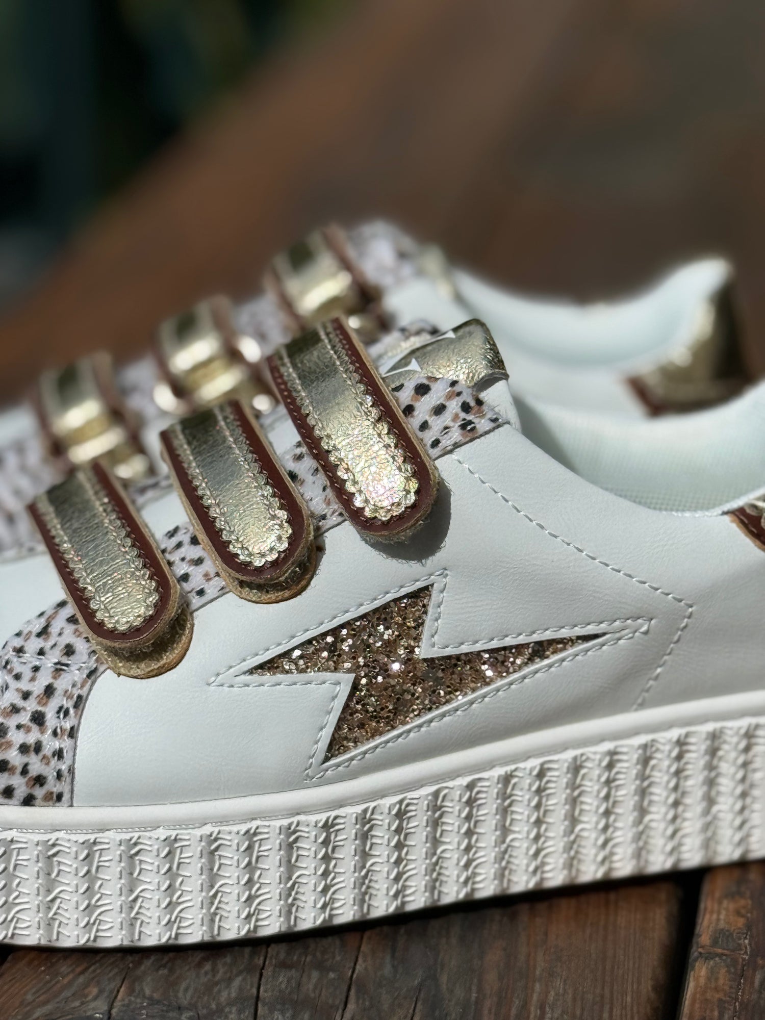 - Fermeture à scratchs en simililcuir festonné et texturé or avec similicuir marron